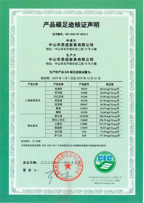 中山市思進家具有限公司-CEC-2020-CF-0024-2-產品碳足跡核證聲明