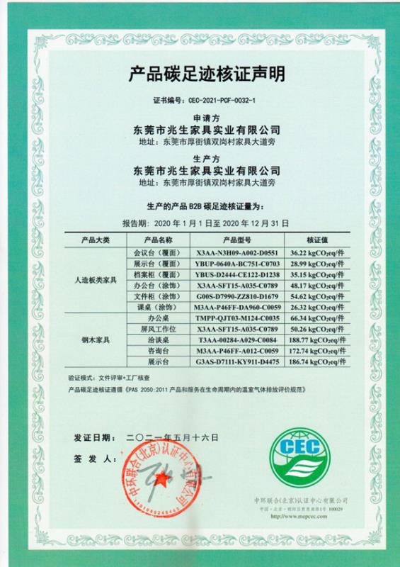 上一篇:東莞市兆生家具實(shí)業(yè)有限公司碳足跡證書-CEC-2021-PCF-0032-2 -鋼木家具+軟體家具