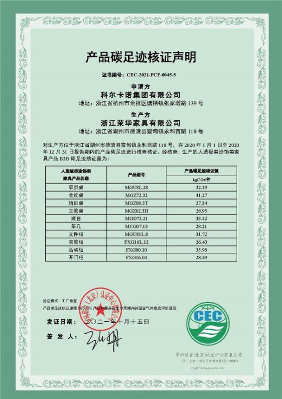 上一篇:浙江榮華家具有限公司碳足跡核證聲明-CEC-2021-PCF-0045-6-人造板類涂飾類家具